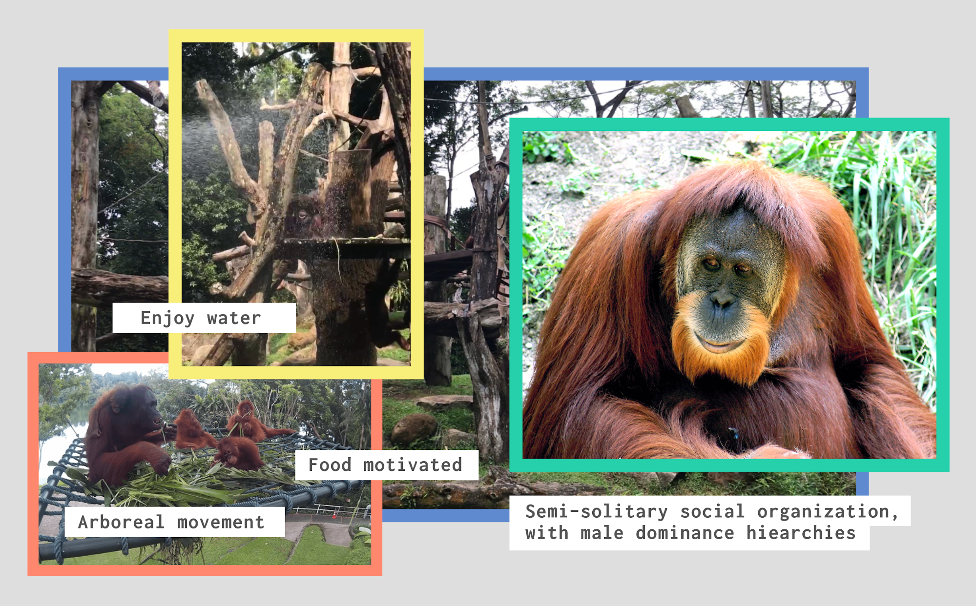 We were designing for two user groups with distinct needs, behaviours and goals - the Singapore Zoo’s twenty-orangutans, and their keepers. The overall goal was to improve the orangutan’s quality of life in captivity. A secondary goal was empowering zookeepers by improving the effectiveness of day-to-day animal upkeep tasks.